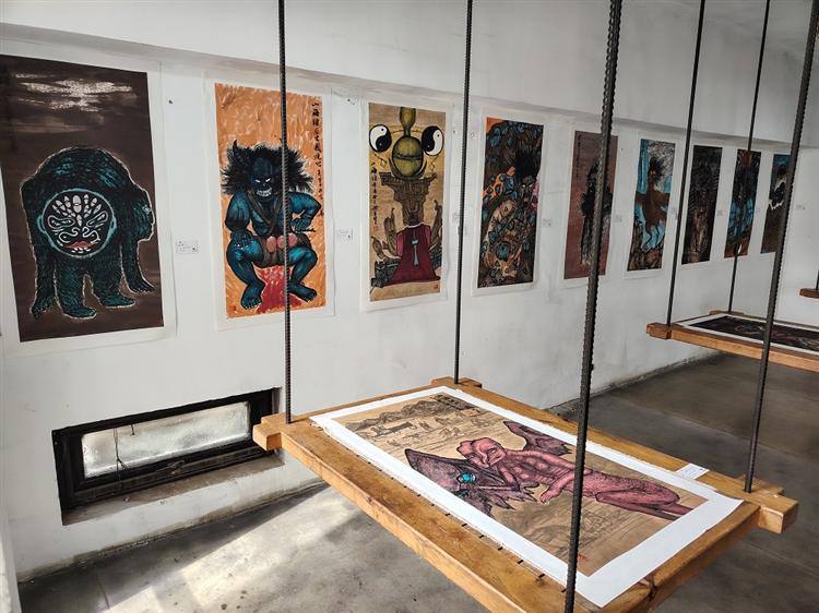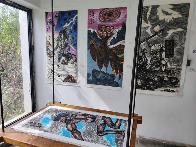 此次展出的水墨画作品50多幅,是楚子今年4月入住上苑国际艺术驻留中心后锐意创新,深度挖掘中国传统文脉精萃,大胆运用当代艺术语言和东西方哲学理念,用心熔铸的全新之作。重传统,大融合。他大胆运用和拓展焦墨画法起稿,自创全新皴法,骨法用笔,放胆敷色,手法多变,画面产生了强烈的视觉和哲学冲击。此次展出作品题材分为三大类:一是“山海经系列”从东方古籍《山海经》中挖掘出上古神话的荒诞与当代超解构、宇宙美学、刻奇的合一;二是“面具系列”,楚子笔下的面具跳出了舞台的局限,走进寻常世界,让生命、生物都戴上面具,使画面更具当代性,超现实,并赋予哲学与文学涵义,或批判,或启示,耐人深思;三是哲思类。这批画融中西方文化、哲学、文学于一体,通过刻画人物体态与表情,表达他的宇宙观,和对人性、生命本体的重新认知。画是判决书,色是哲学眼。